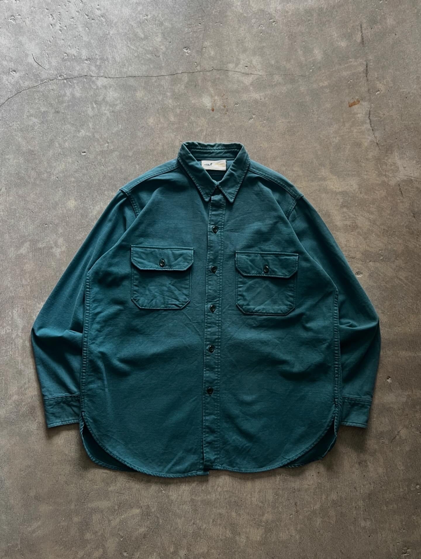 しっかりしたダック地のタフな質感と、深みのあるグリーン系カラーが雰囲気抜群。シャツとしてもライトアウターとしても使える“シャツジャケット”ポジションで、春秋は羽織り、冬はインナー差しで長く活躍します。無骨なワークディテール(2ポケット・太めステッチ)で、デニム/チノ/軍パンと相性◎。タグよりUSA製。