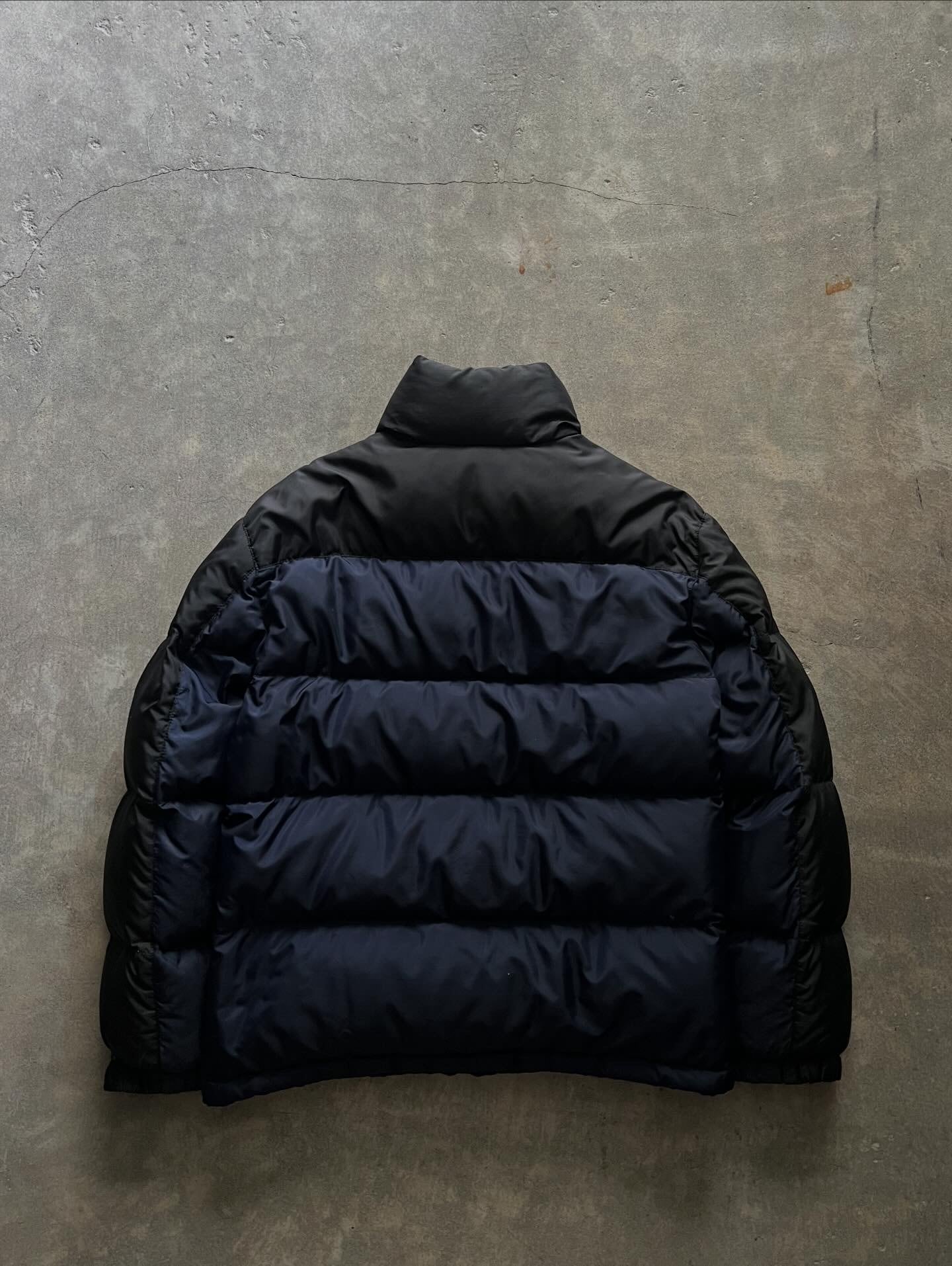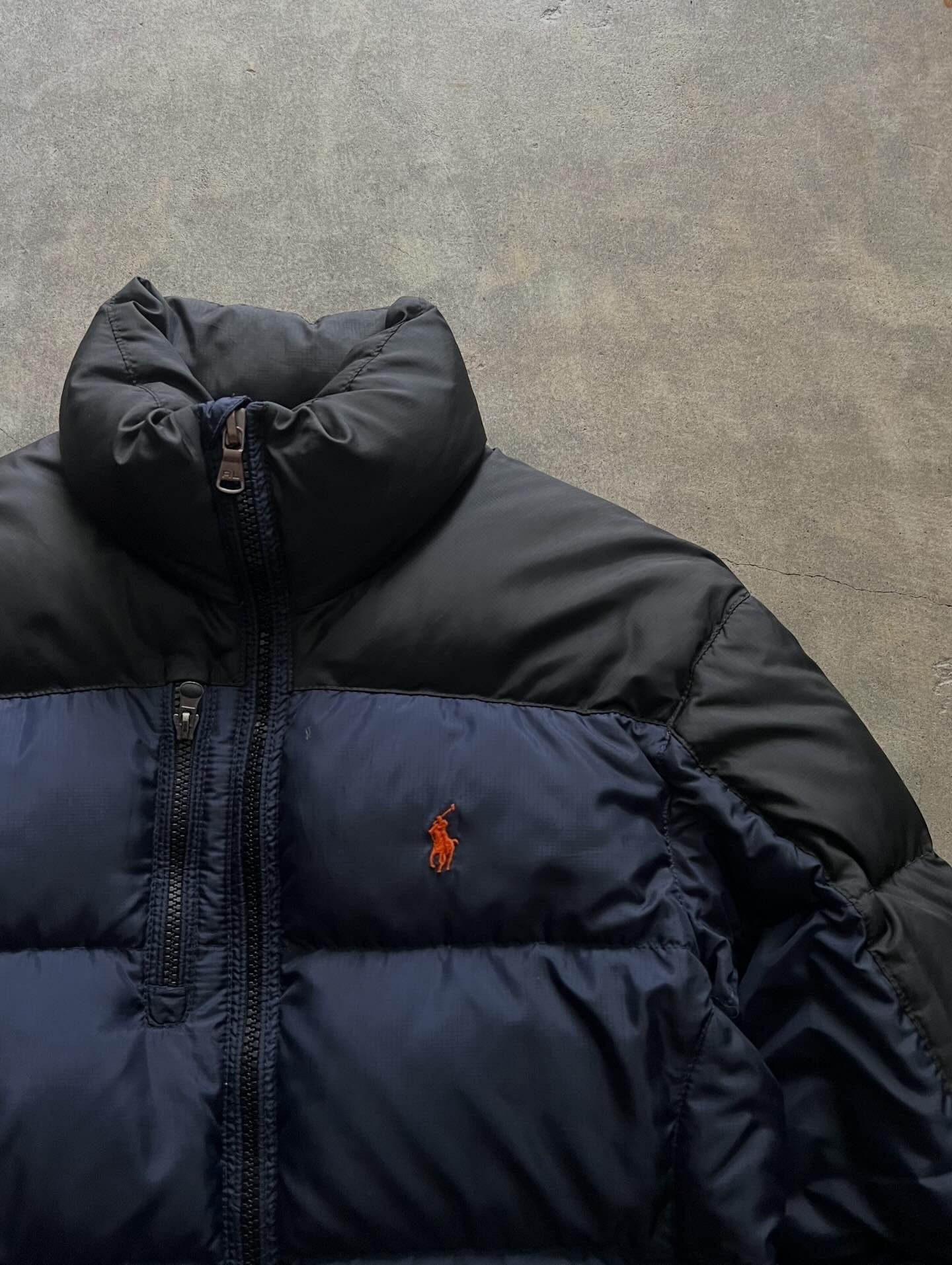 ネイビー×ブラックの切替が映えるラルフの定番ダウン。ボリューム感のあるシルエットで保温性もしっかり。胸元のオレンジポニー刺繍が程よいアクセントになり、カジュアルにもストリートにも合わせやすい一着です。デニムやスウェットパンツはもちろん、スラックス外しにも◎。