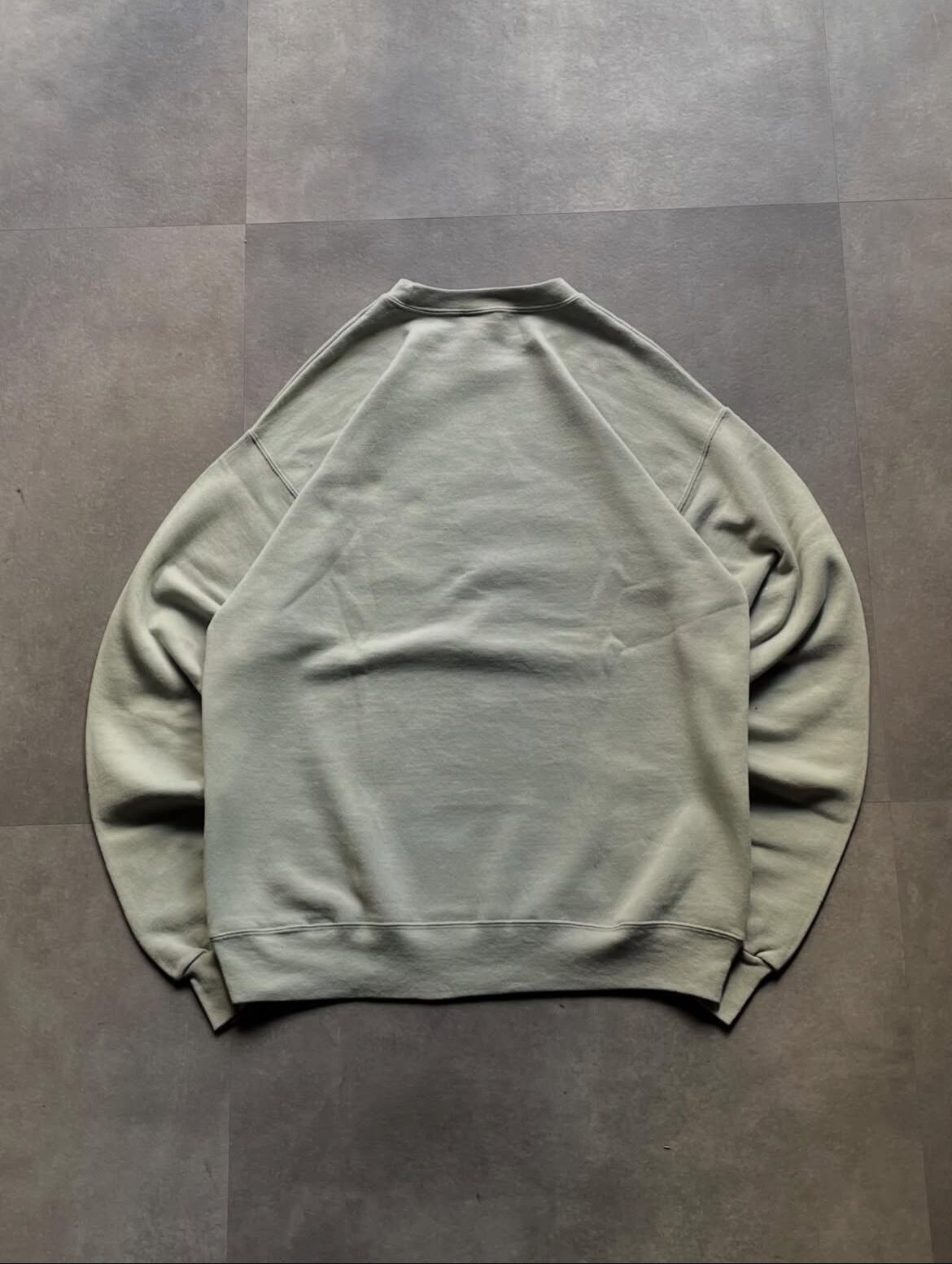 くすんだオリーブ(セージ系)カラーが雰囲気のある無地スウェット。ロゴ無しのミニマルな見た目で、デニム・チノ・軍パン・スラックスまで合わせやすい万能型です。肩の落ち感が自然に出て、1枚でもインナーでも活躍。ecoSmart表記でリサイクル素材を使用したシリーズです。