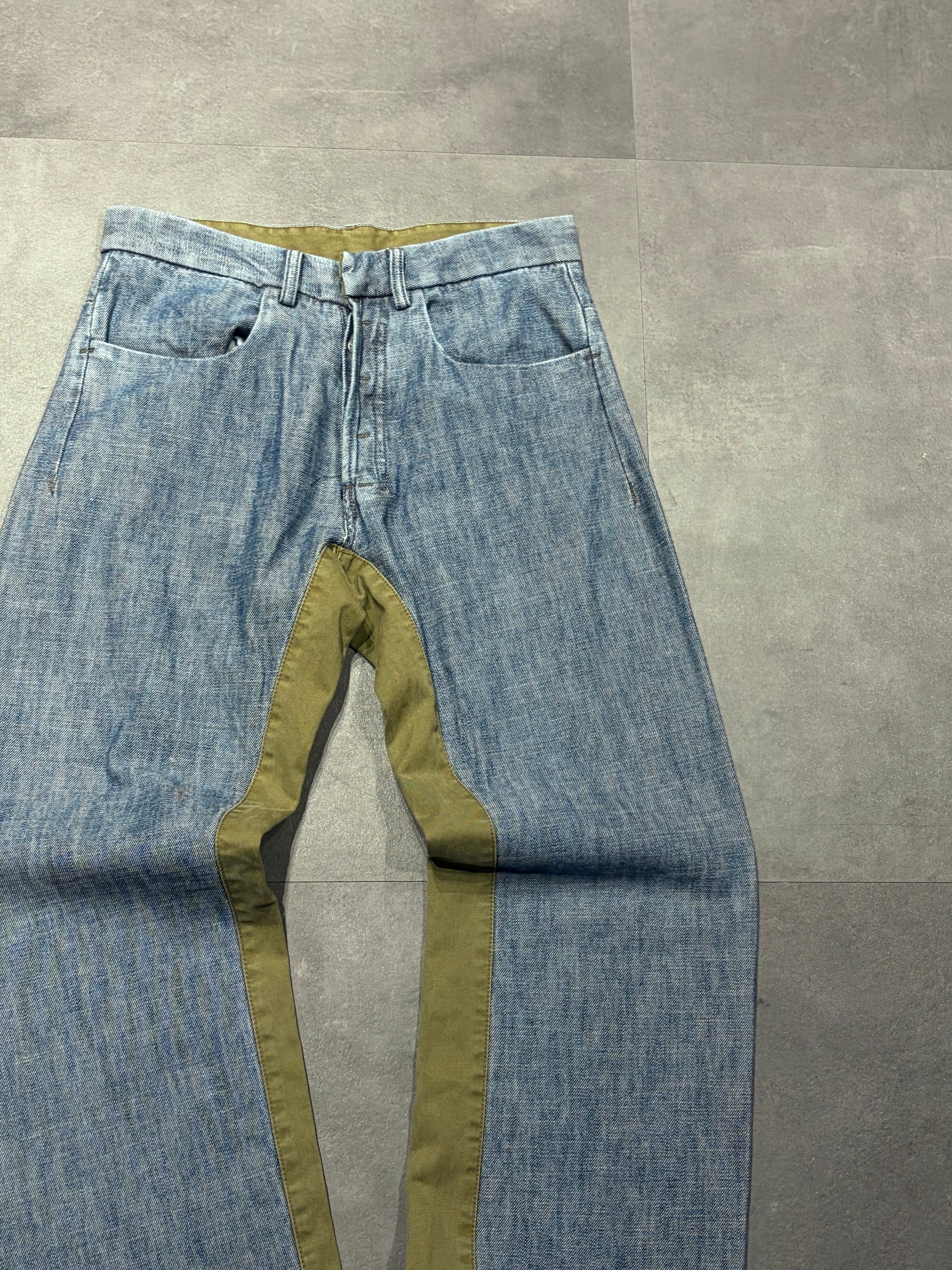 ライトブルーのデニムをベースに、内腿部分にオリーブカラーの切替が入ったデザイン性の高いパンツです。