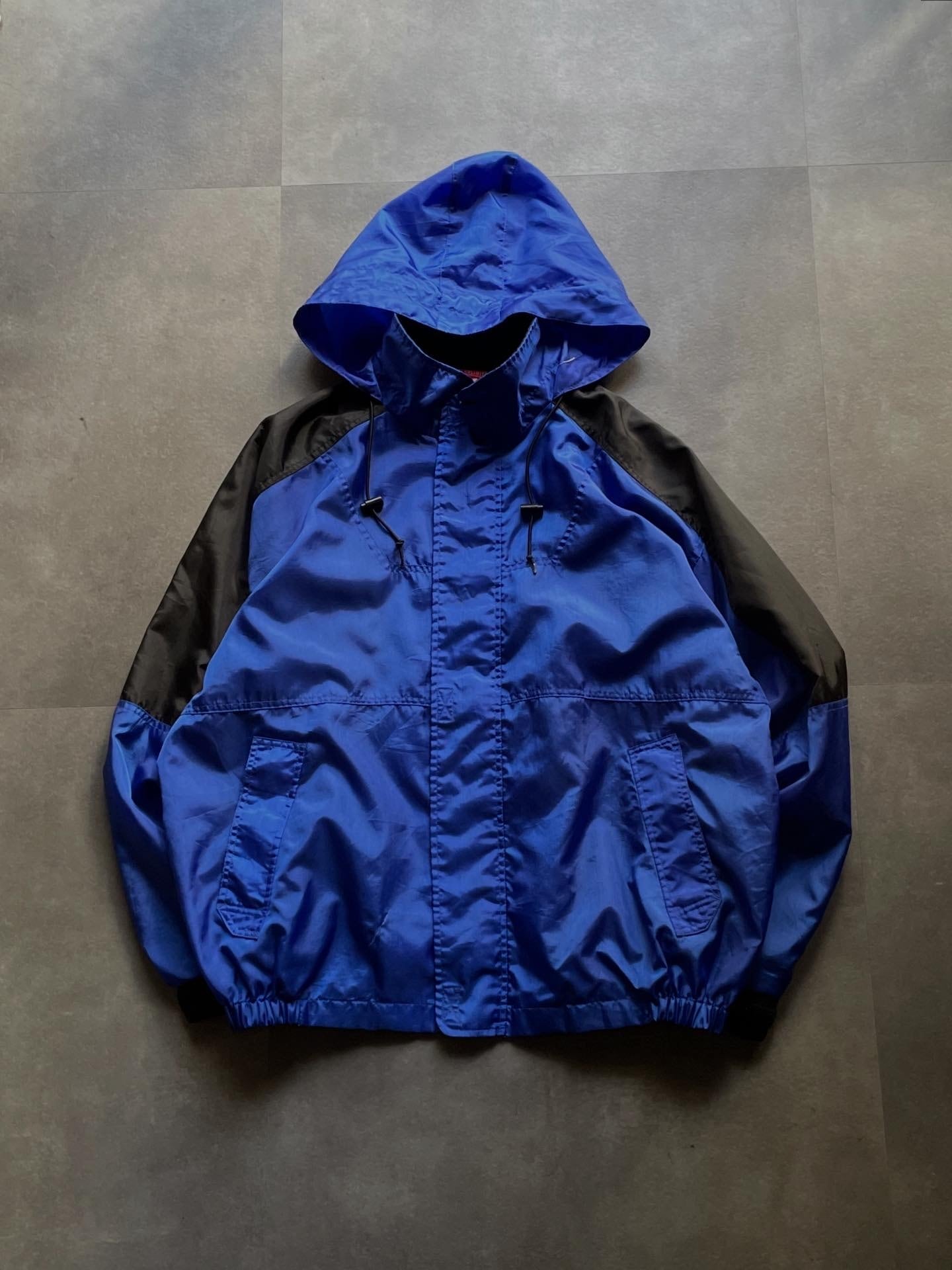 鮮やかなブルーにブラックの切り替えが映える、Marlboro UNLIMITED のフード付きナイロンジャケットです。
