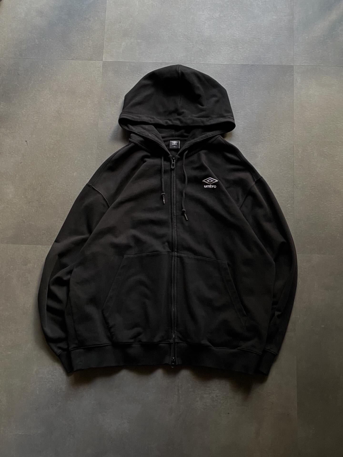 シンプルなブラックボディに、胸元の Umbro ロゴが映えるフルジップパーカーです。