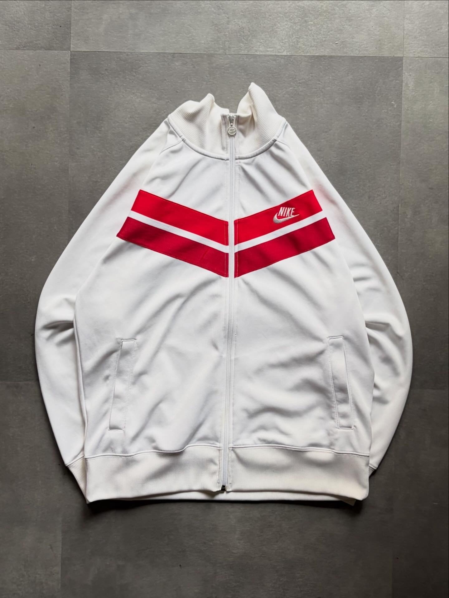 白ボディに赤のV字ラインが映える、NIKEのトラックジャケットです。