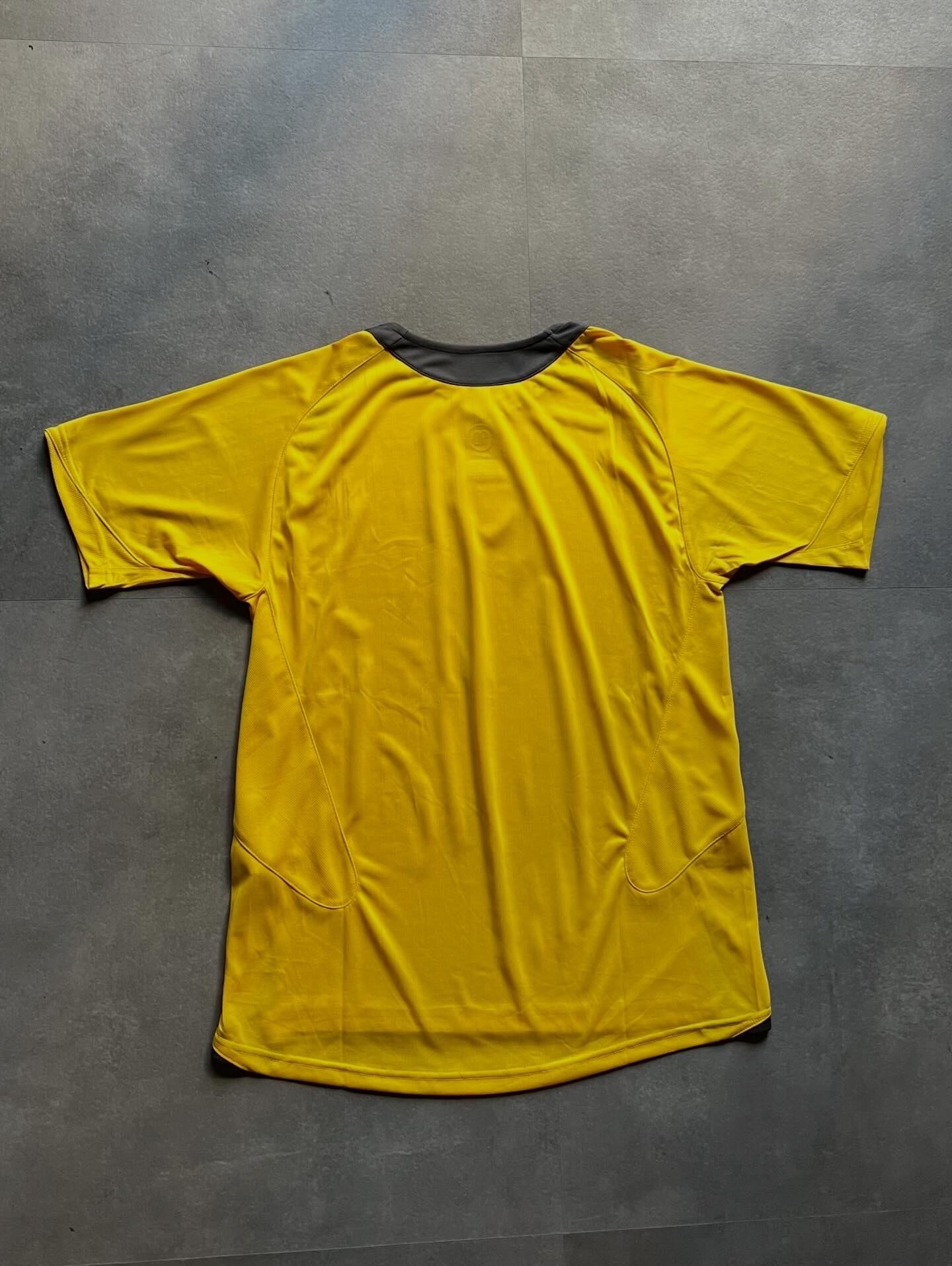 鮮やかなイエローボディにダークグレーの切り替えが映える、Arsenalのゲームシャツです。
