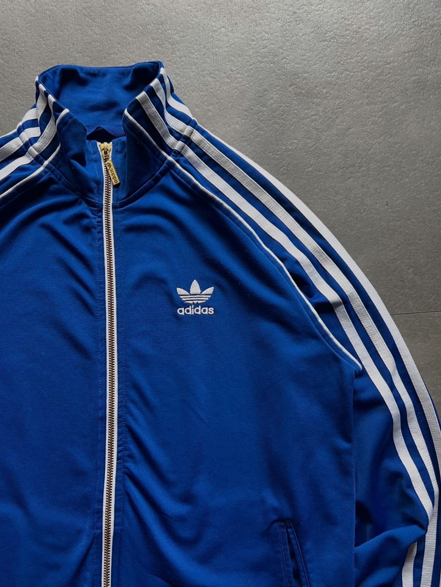 鮮やかなブルーにホワイトの3ラインが映える、adidas Originalsのトラックジャケットです。