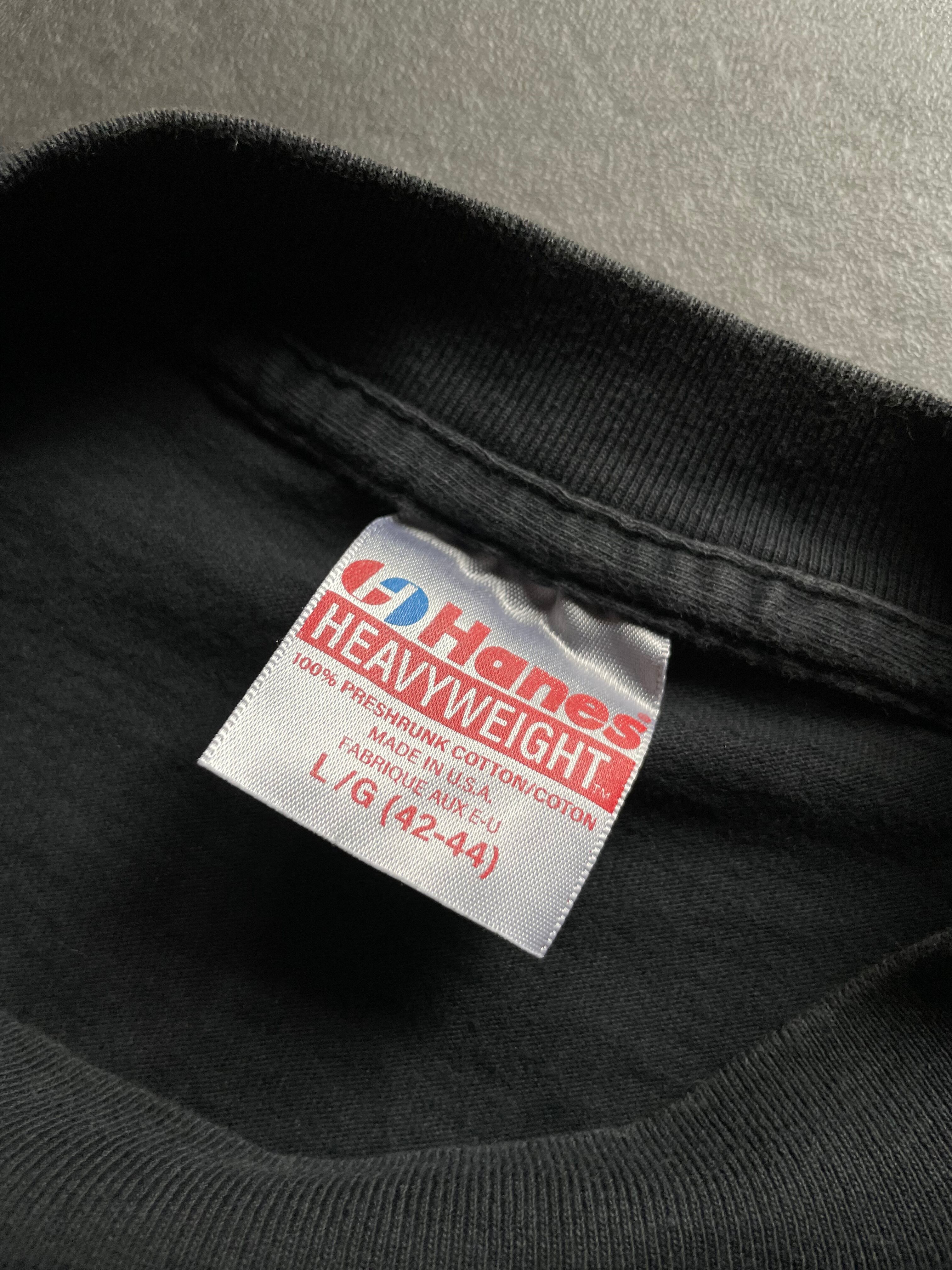MADE IN U.S.A.表記、100% COTTON、サイズ表記L/G(42-44)が確認できる個体です。前後ともにプリントが入るため、着用時の見栄えも非常に良いです。