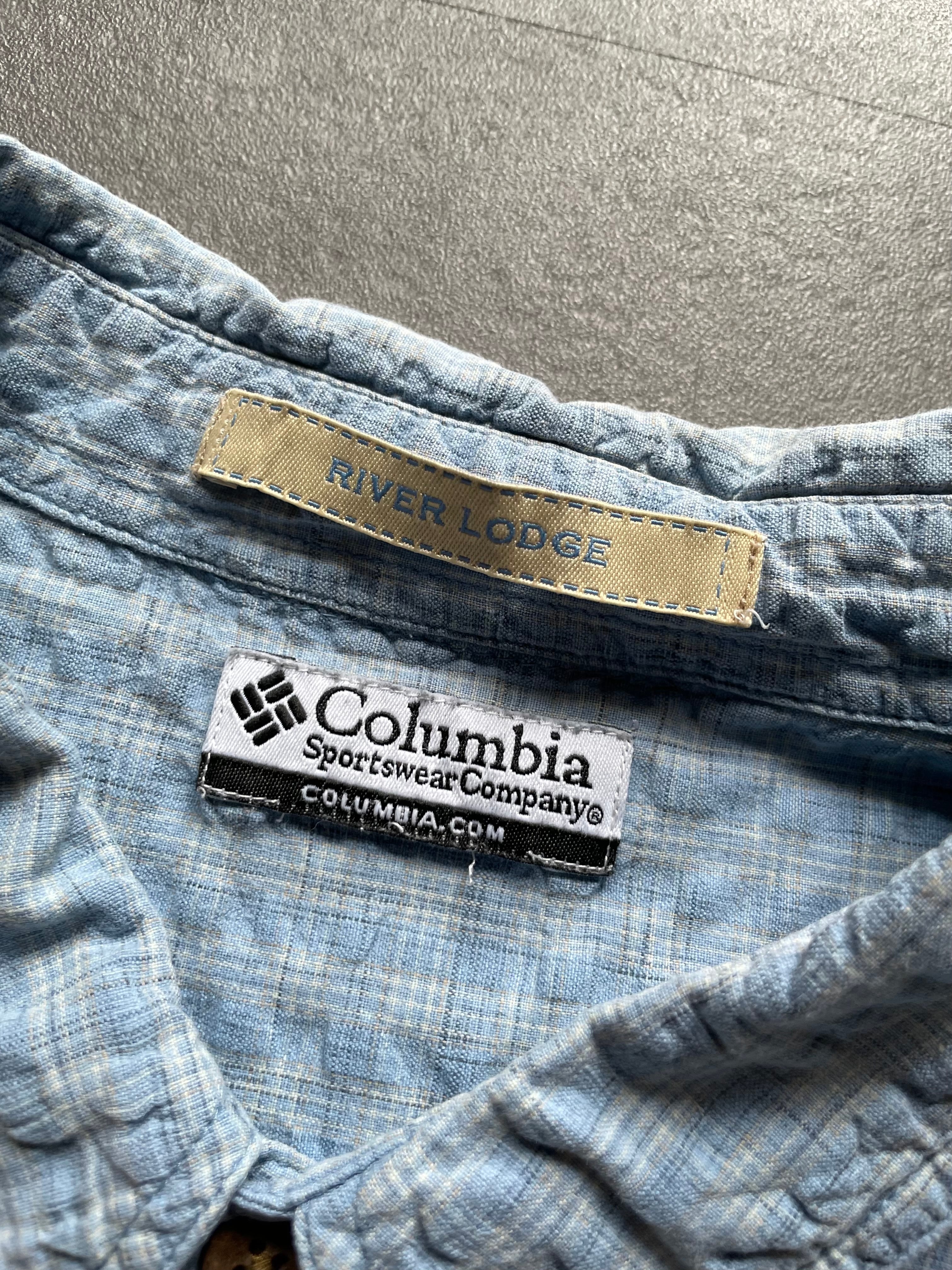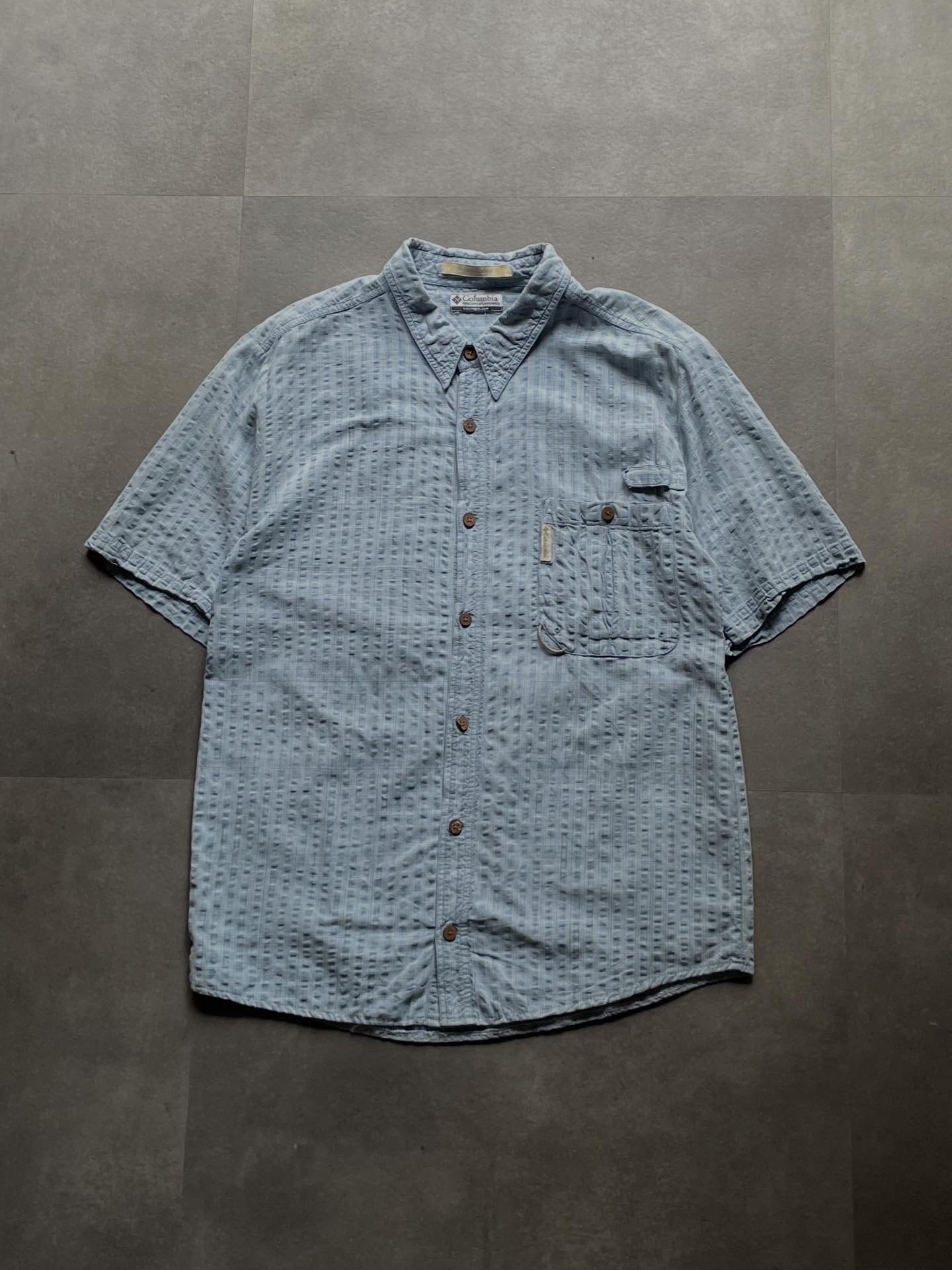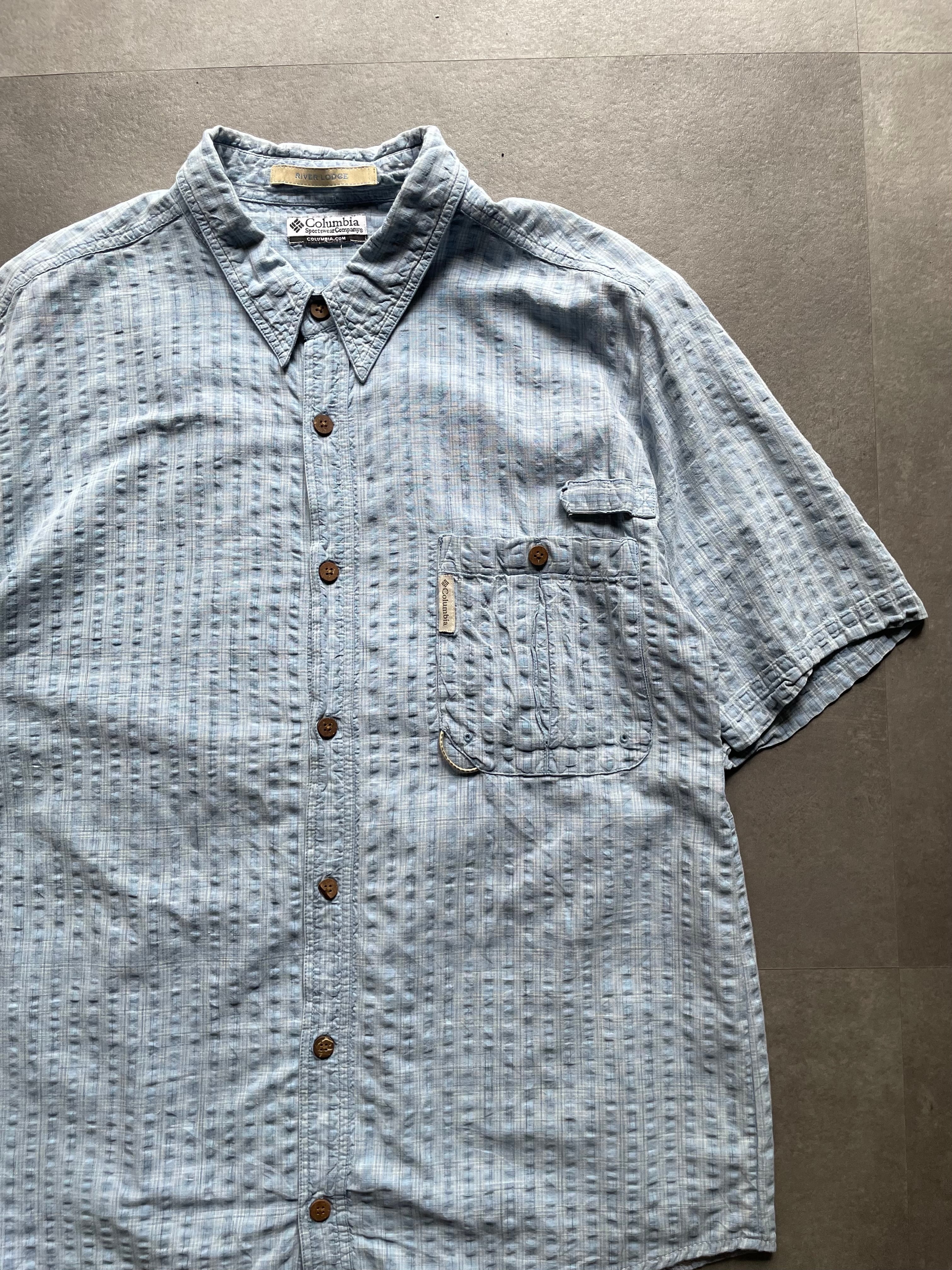 Columbia RIVER LODGE 半袖シャツ ライトブルー 凹凸生地 ポケット