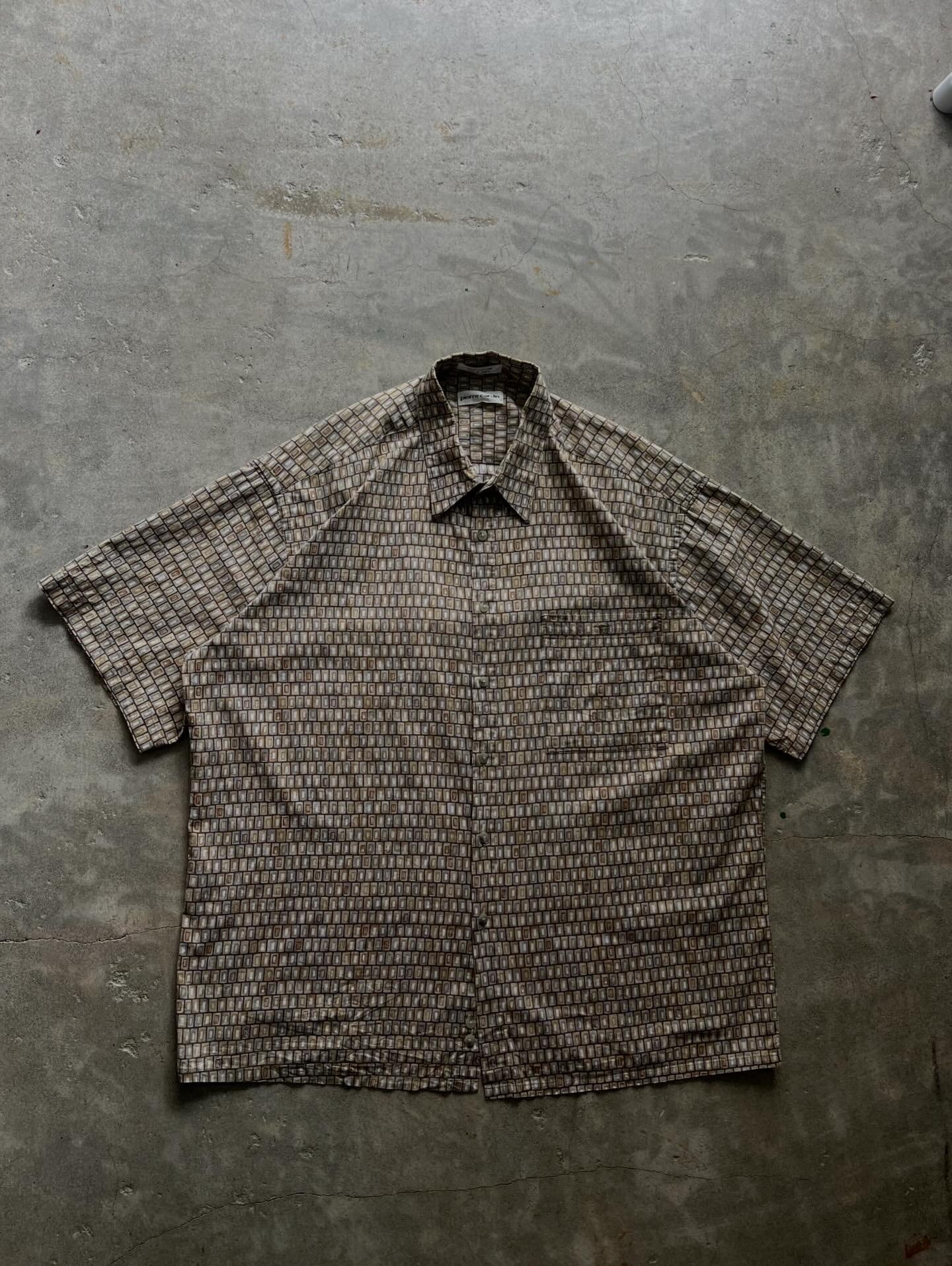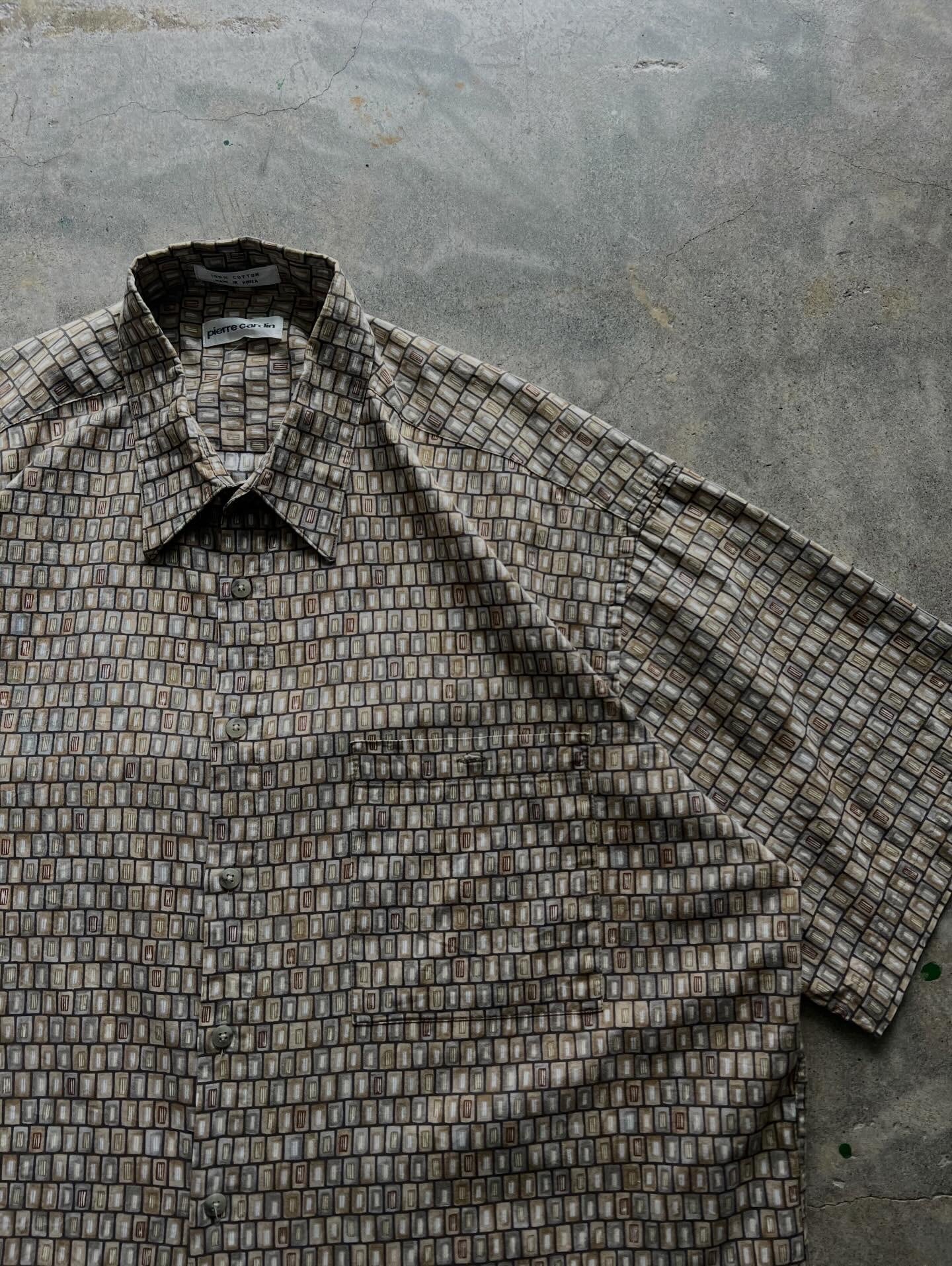 pierre cardin、ピエールカルダン、総柄シャツ、半袖シャツ、コットンシャツ、韓国製、ベージュ、ブラウン、幾何学柄、オーバーサイズ、古着、メンズ