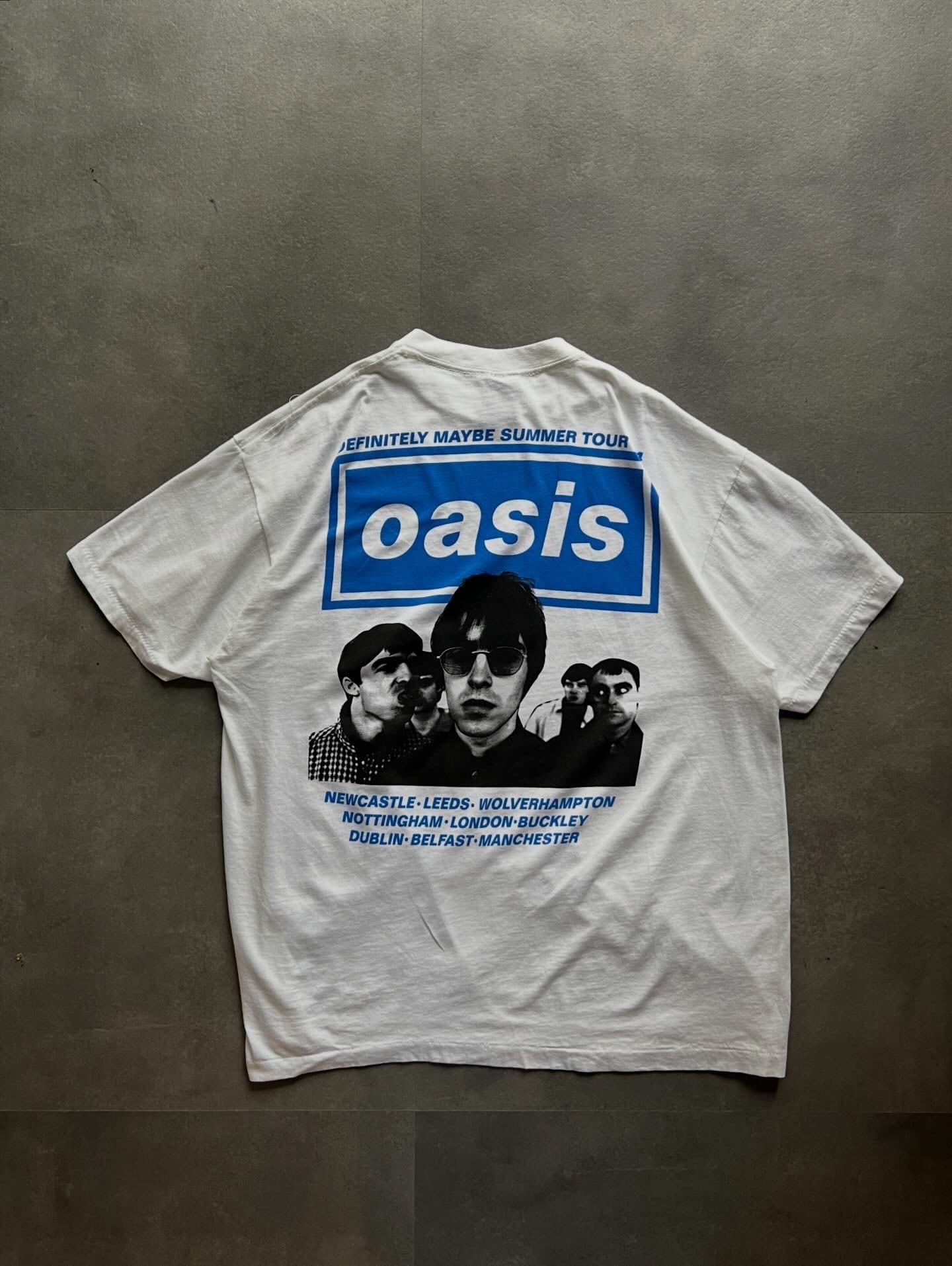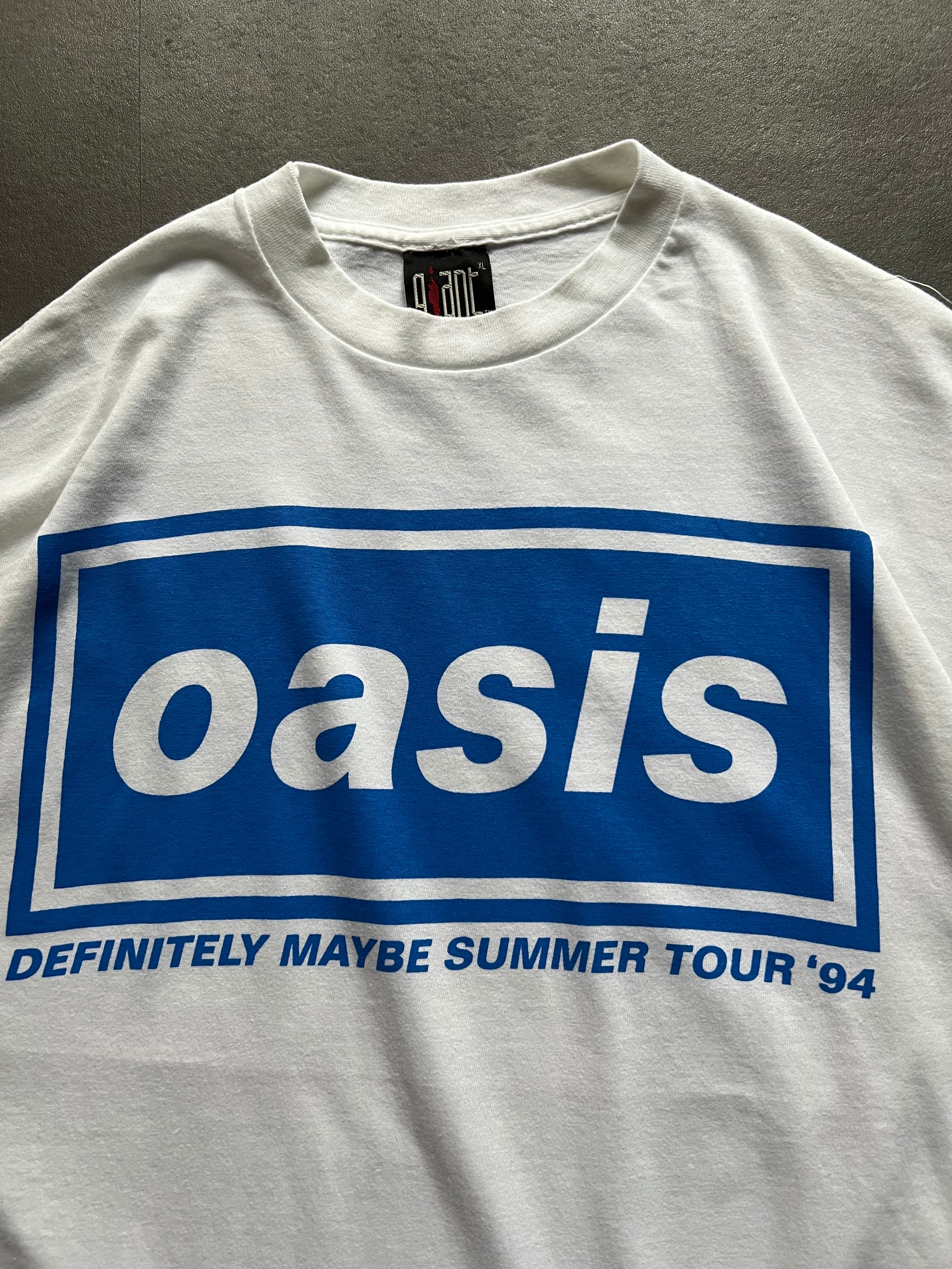 フロントにはoasisのロゴと「DEFINITELY MAYBE SUMMER TOUR ’94」プリント、バックにはメンバーフォトとツアー都市名が入った存在感のある1着です。