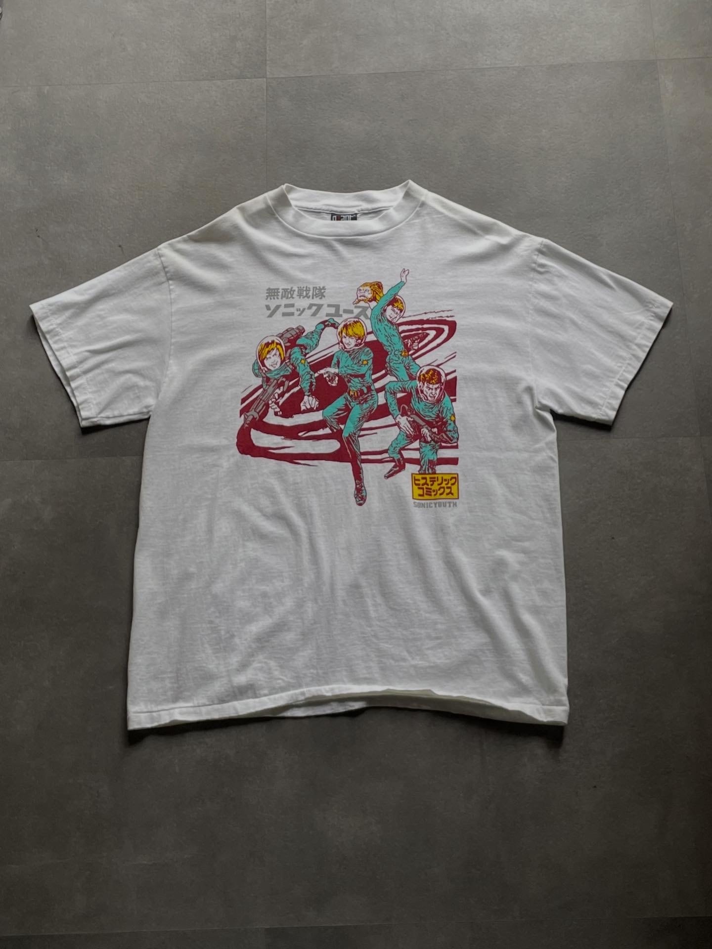 フロントには日本語ロゴとコミック調のグラフィック、背面にはインパクトのある「SONIC YOUTH」とカタカナロゴが入る、非常にデザイン性の高い一枚です。