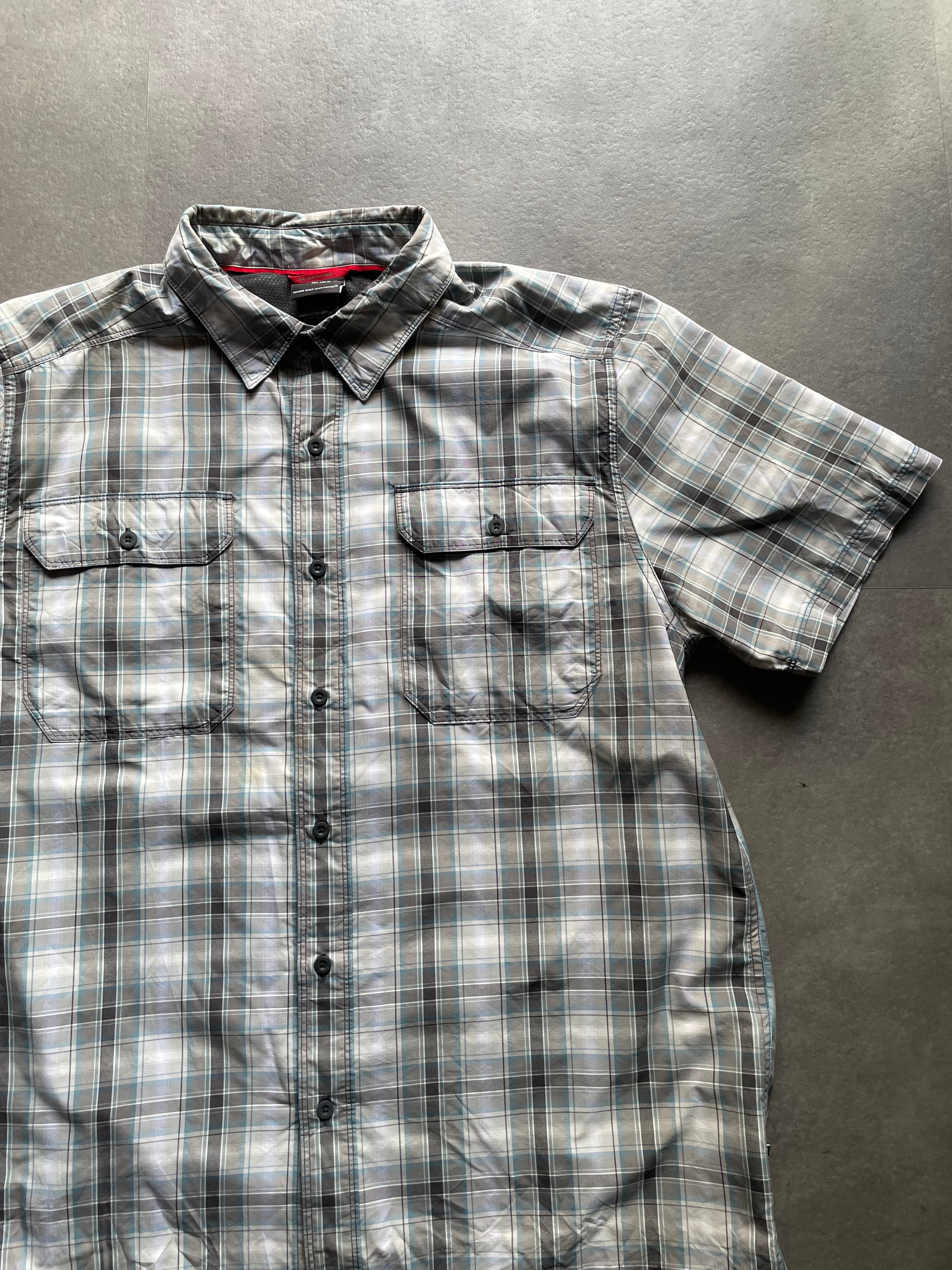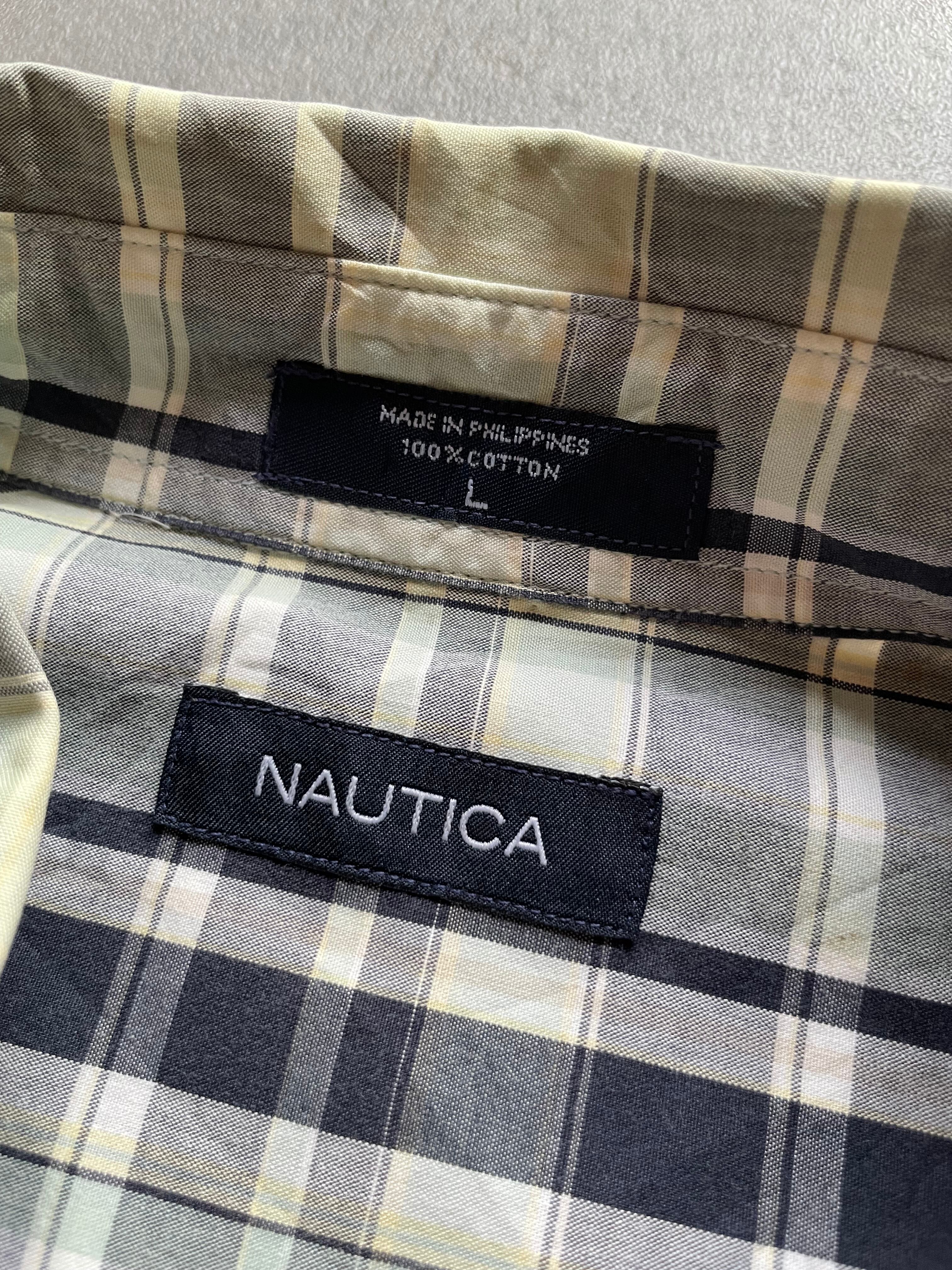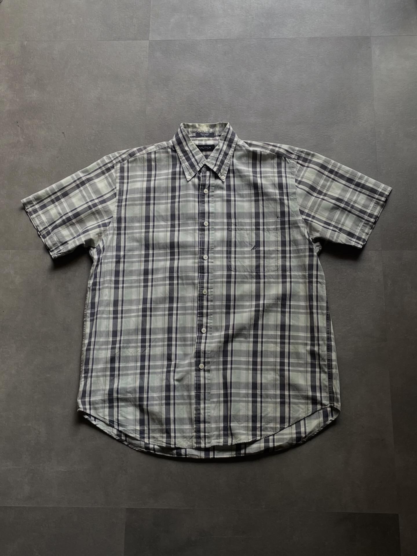 NAUTICA 半袖シャツ チェック L コットン グレー系 刺繍ロゴ