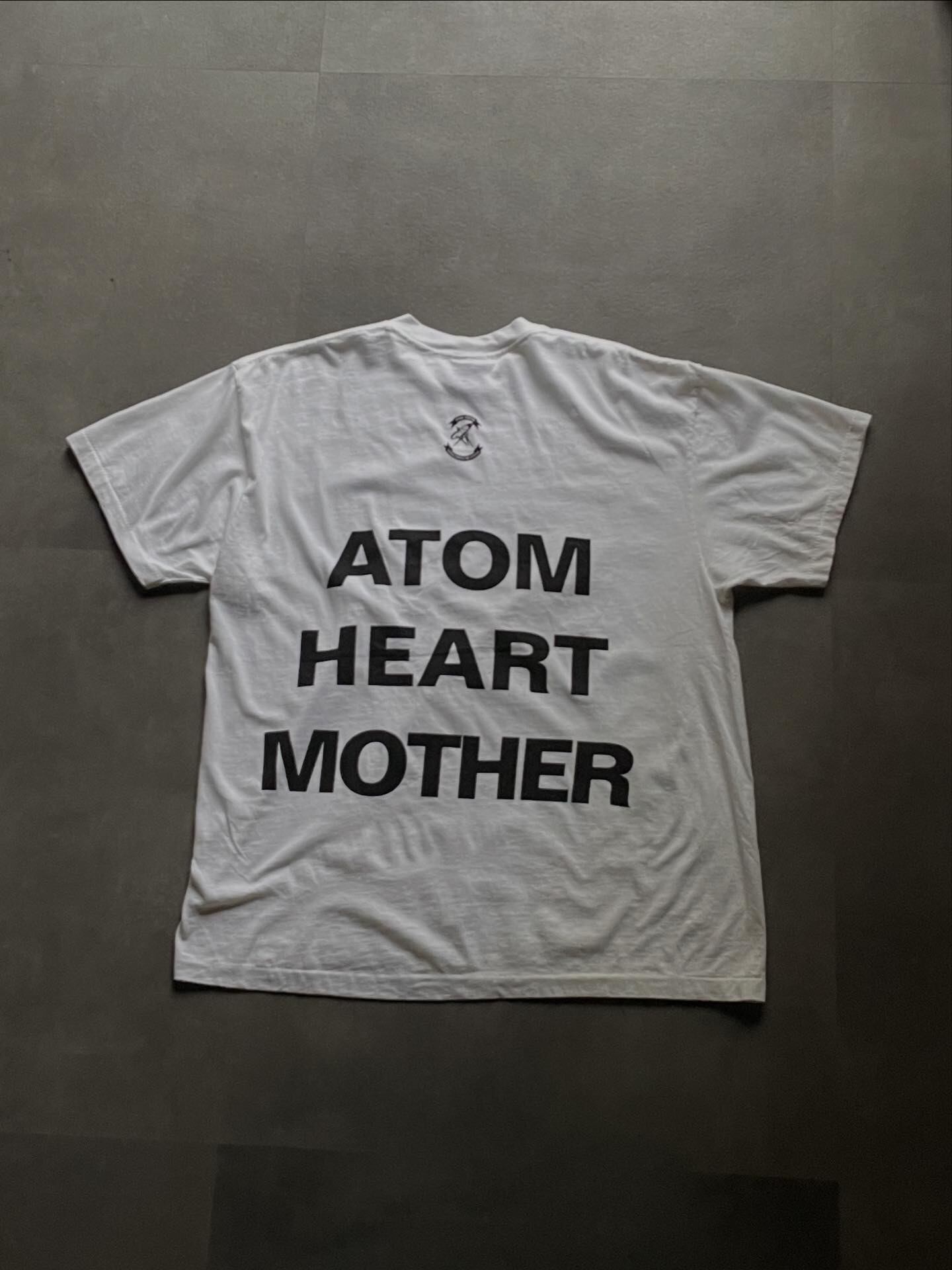フロントには印象的な牛のビジュアル、バックには大胆な「ATOM HEART MOTHER」ロゴが入る両面プリント仕様です。